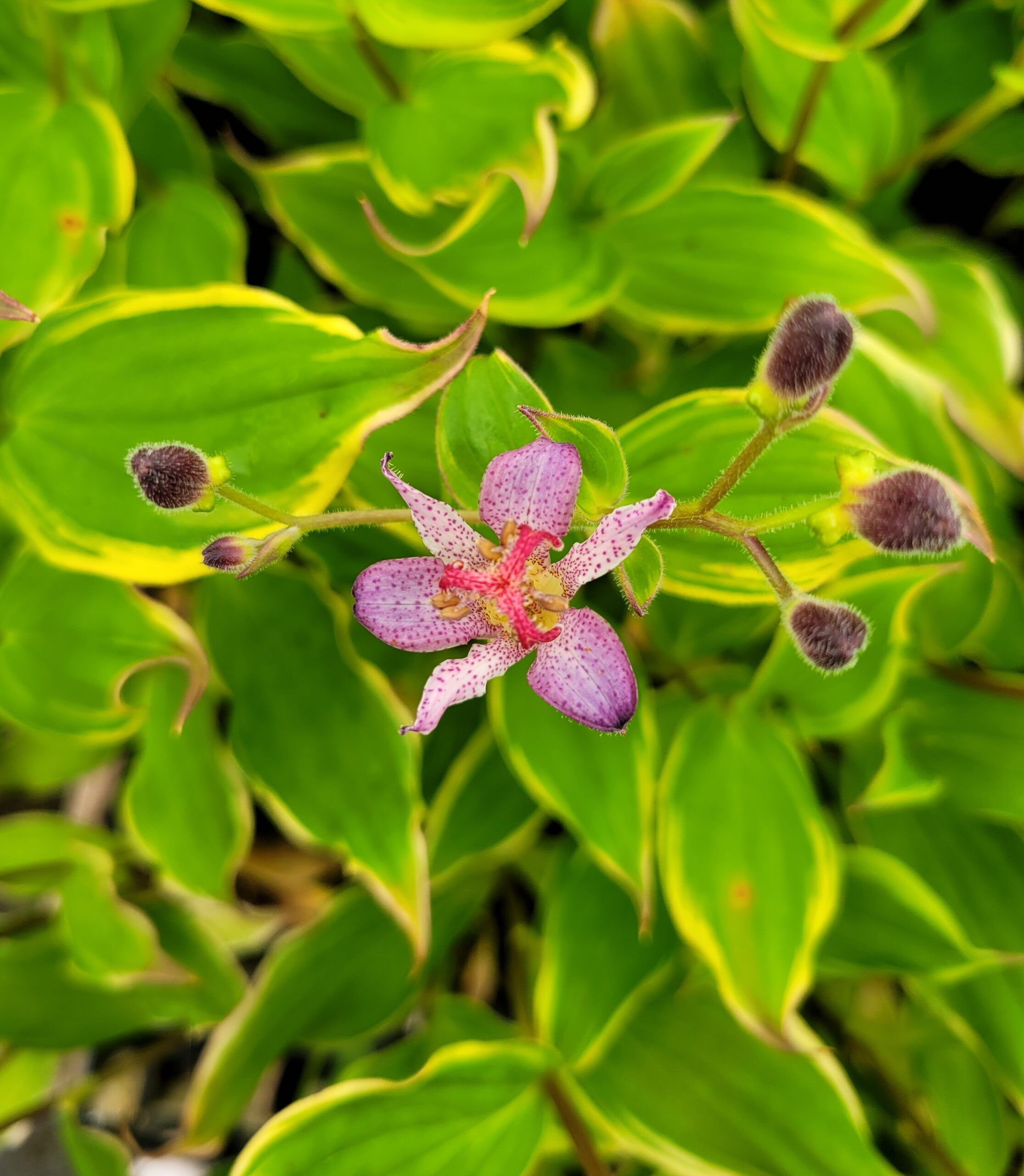 Tricyrtis formosana ‘Autumn Glow’ displays exotic, purple-white flowers with violet spotting on arching stems. Varigated green leaves put on a show of their own, too. Perfect in shady or woodland gardens.